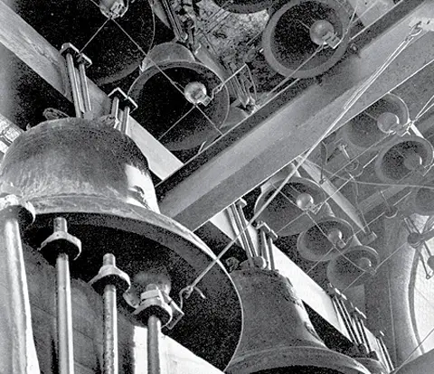 All the bells were soon removed; the steel framework shored up: and the wooden beams replaced by new oak beams. Two new, larger bells were ordered from the Paccard Foundry.