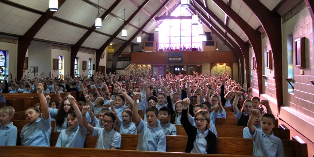 But before placing the Miraculous Medals on their bags, the second- through eighth- grade students brought them to Mass, where after a homily about St. Catherine Labouré and the Miraculous Medal, they prayed a consecration to Our Lady of the Miraculous Medal and had them blessed. One of the parish priests visited the students in kindergarten and first grade, where he led them in prayer and blessed their medals.